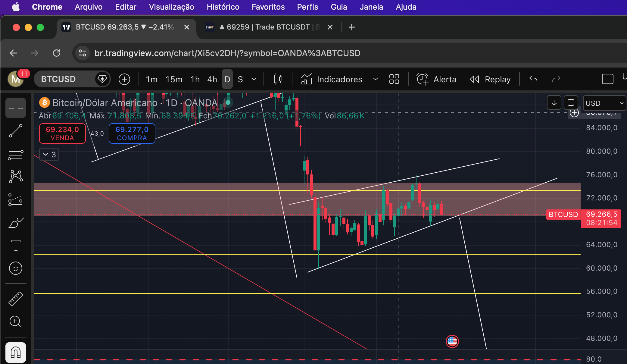 BTC em uma zona de indecisão, bem difícil operar trades curtos nessas condições. Ainda que não fosse me empenhar no app. preciso de um rumo do mercado, tentar adivinhar vai me fazer perder dinheiro!